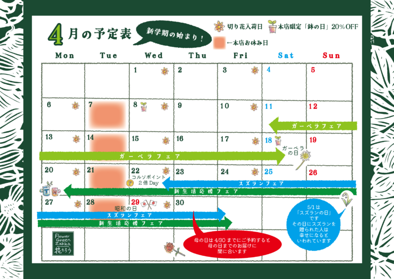 母の日当日までにお花のお届けをご希望の方は、4月30日(木)までにお申し込みください