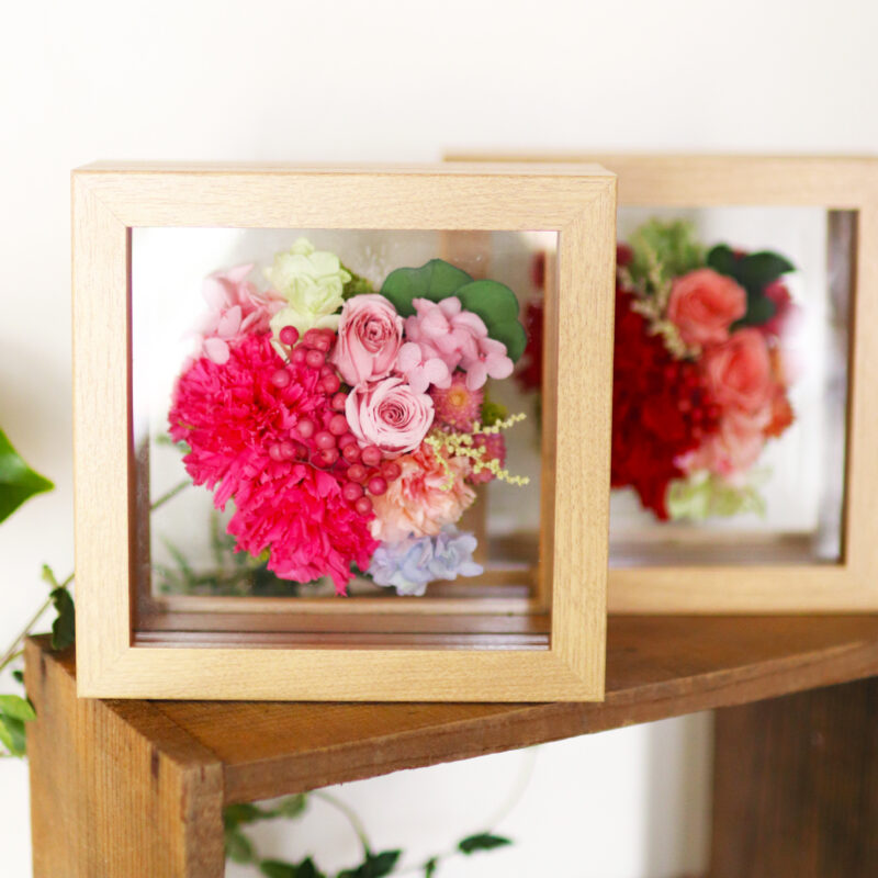 木目調フレームとガラスのおしゃれなBOXに、カーネーションをメインにバラ・千日紅など彩り豊かなお花を散りばめました