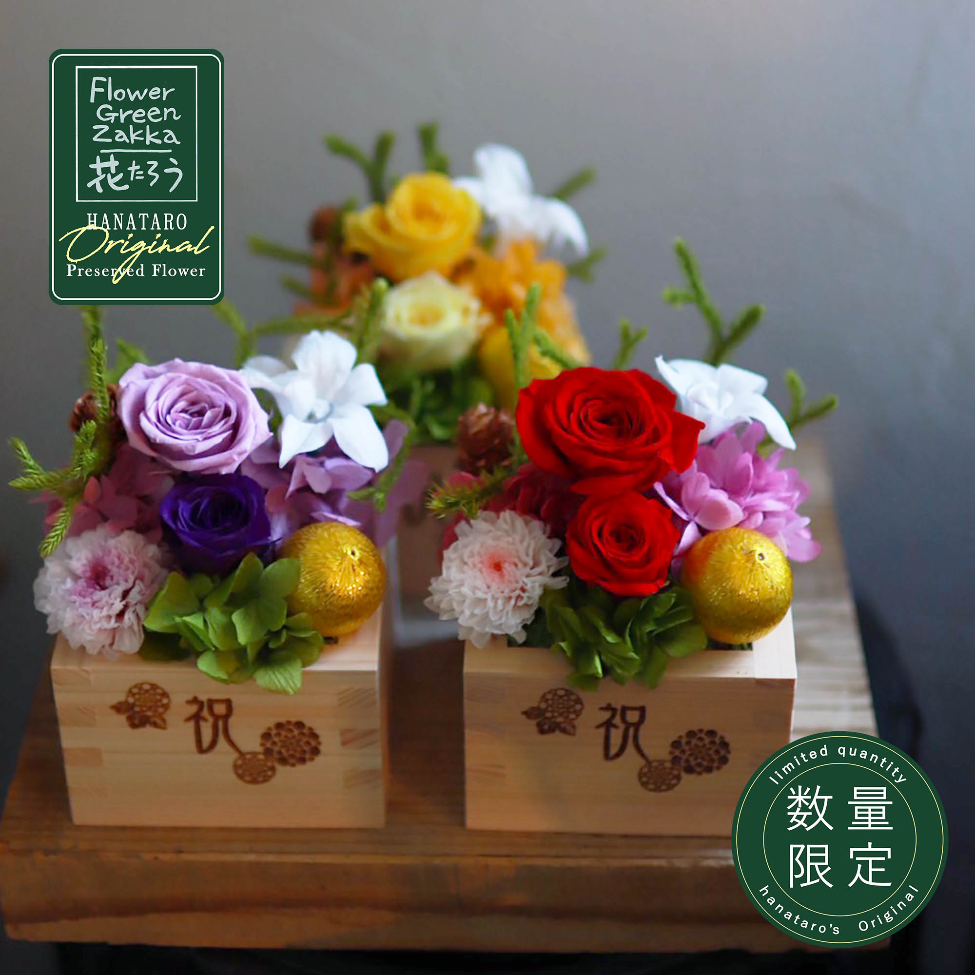 【花たろう オリジナルプリザーブドフラワー】 桝に色鮮やかなお花をあしらった和テイストのプリザーブドフラワーです 長寿のお祝いとしておススメです 還暦には「赤」、古希・喜寿には「紫」、傘寿・米寿には「黄」がお祝いの色味とされています 長寿を願う「祝いマス」を贈って益々家族の絆を深めてみてはいかがでしょうか
