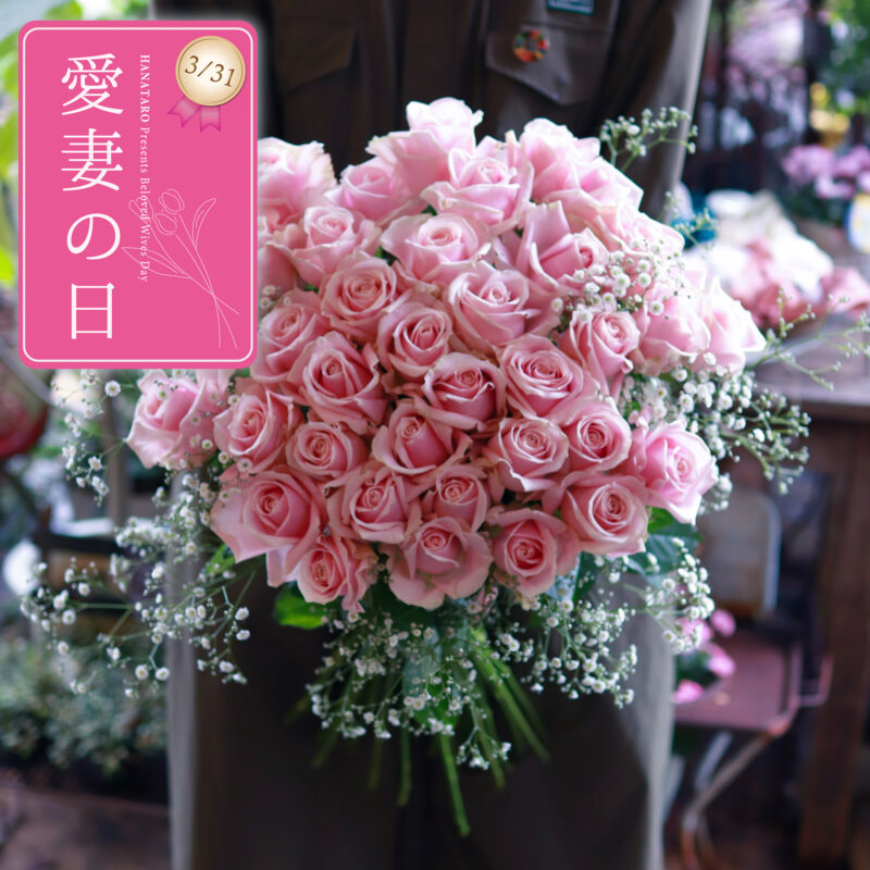 バラとカスミソウだけを束ねた人気のある花束です バラのお色味・本数等、お好みに合わせて変更もできますのでご相談ください