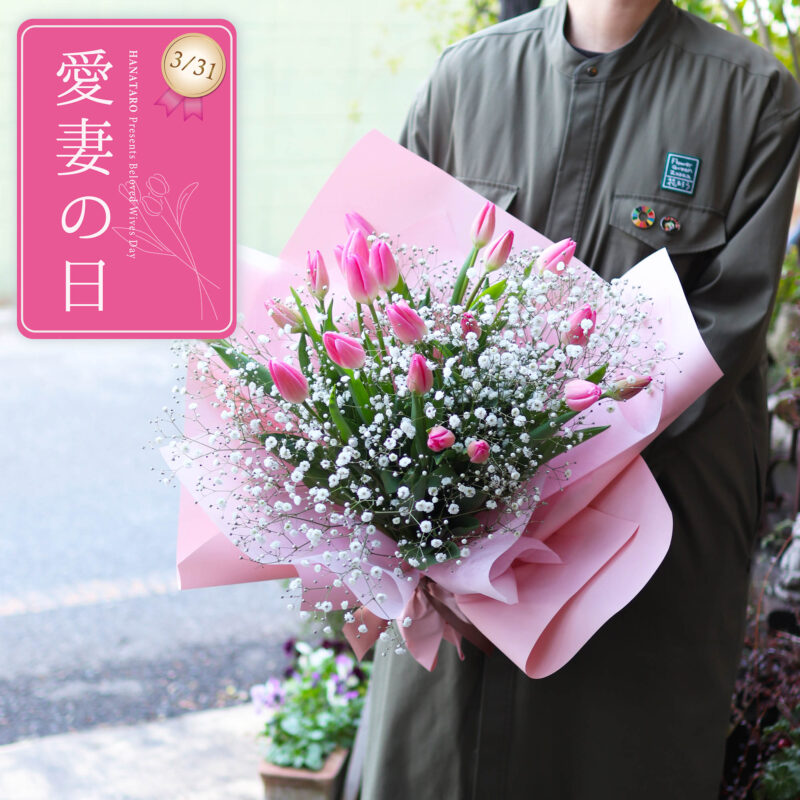 チューリップとカスミソウだけを束ねた可愛らしい春の花束です チューリップのお色味・本数等、お好みに合わせて変更もできますのでご相談ください
