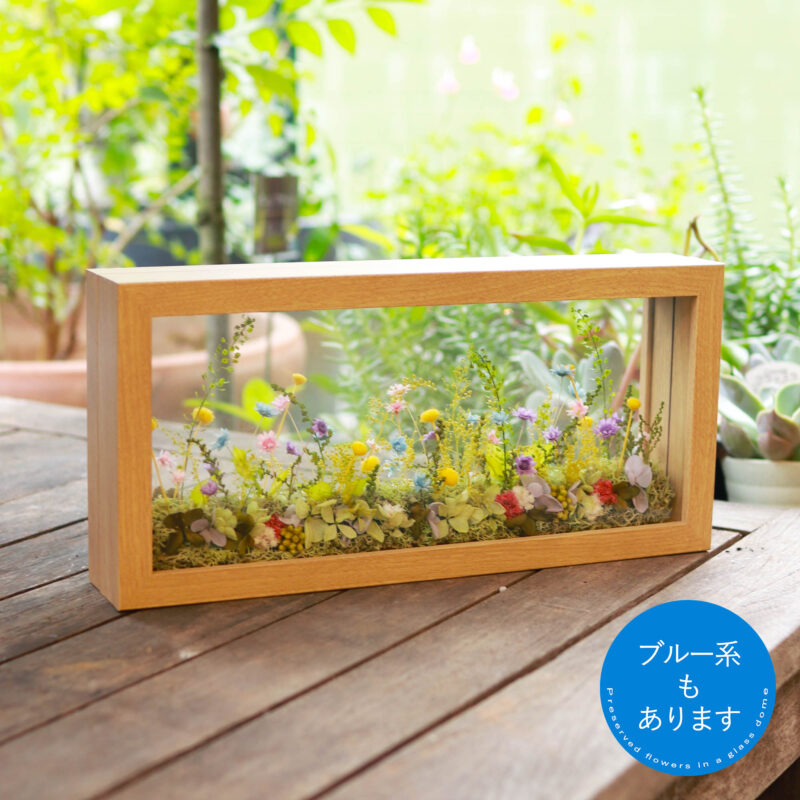 額の中に入った、今までにないスタイルのプリザーブドフラワーです 【S】サイズを横長にした大きさです お部屋のインテリアのワンポイントとしておススメです お色味はミックスカラーとブルー系がございます 【ミルフルールL】