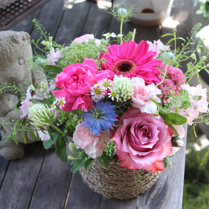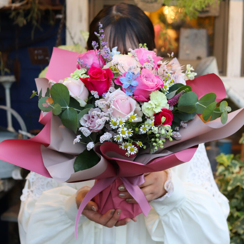 色々な小花が入ったかわいらしいスタンディングブーケです 優しい色合いで幅広いご用途にお使いいただけます