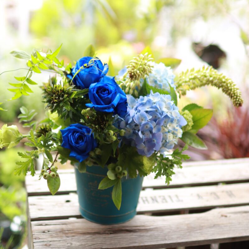 人気のあるブルーをメインにグリーンを贅沢に使ったナチュラルなアレンジメントです ブルーのお花は希少なため、ご注文の際は事前にお問い合わせください