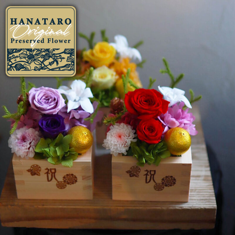 【花たろう オリジナルプリザーブドフラワー】 桝に色鮮やかなお花をあしらった和テイストのプリザーブドフラワーです 長寿のお祝いとしておススメです 還暦には「赤」、古希・喜寿には「紫」、傘寿・米寿には「黄」がお祝いの色味とされています 長寿を願う「祝いマス」を贈って益々家族の絆を深めてみてはいかがでしょうか 敬老の日の贈り物としてもおススメです