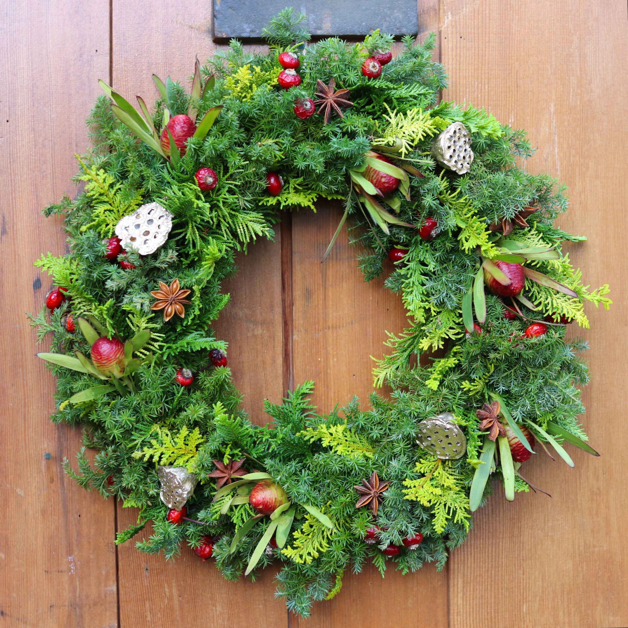 たくさんの実ものを使ったかわいらしいラウンドリースです 見ているだけで楽しくなるようなデザインです