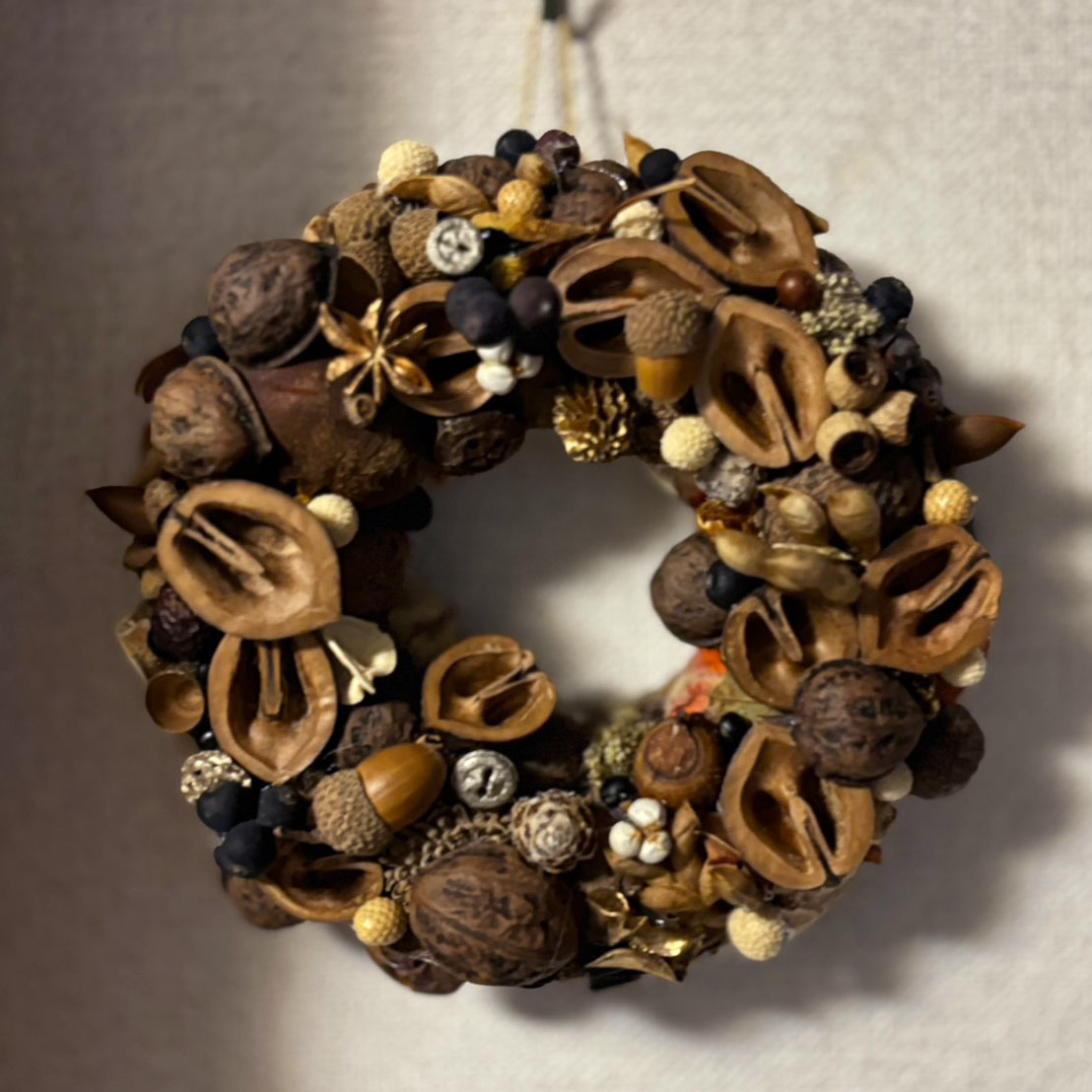 たくさんの木の実だけで作った、コンパクトだけど目を惹くラウンドリースです 木の実によって色々な表情があり、とてもかわいらしいです