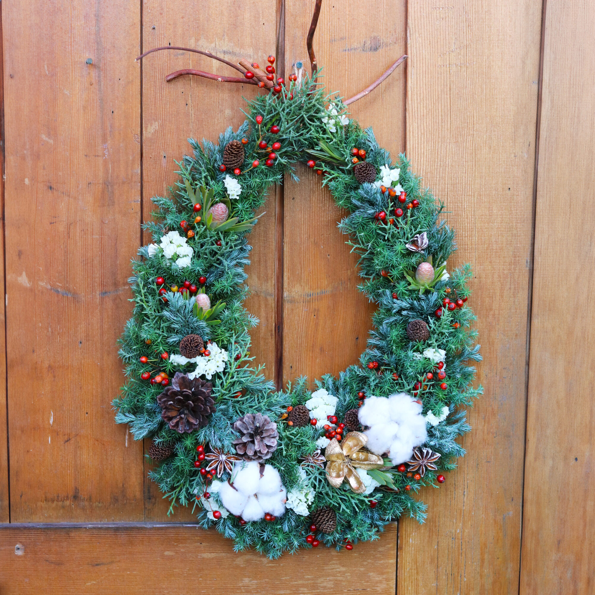 コットンと松笠が主役のクリスマスが待ち遠しくなるようなティアドロップリースです 定番の飾りをたくさん使っていて個性的なデザインなので、とても存在感があります