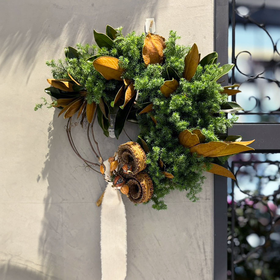 シンプルにブラウンとグリーンだけでデザインしたアシンメトリーリースです ポイントに麻のリボンをプラスしてナチュラルな雰囲気にしています