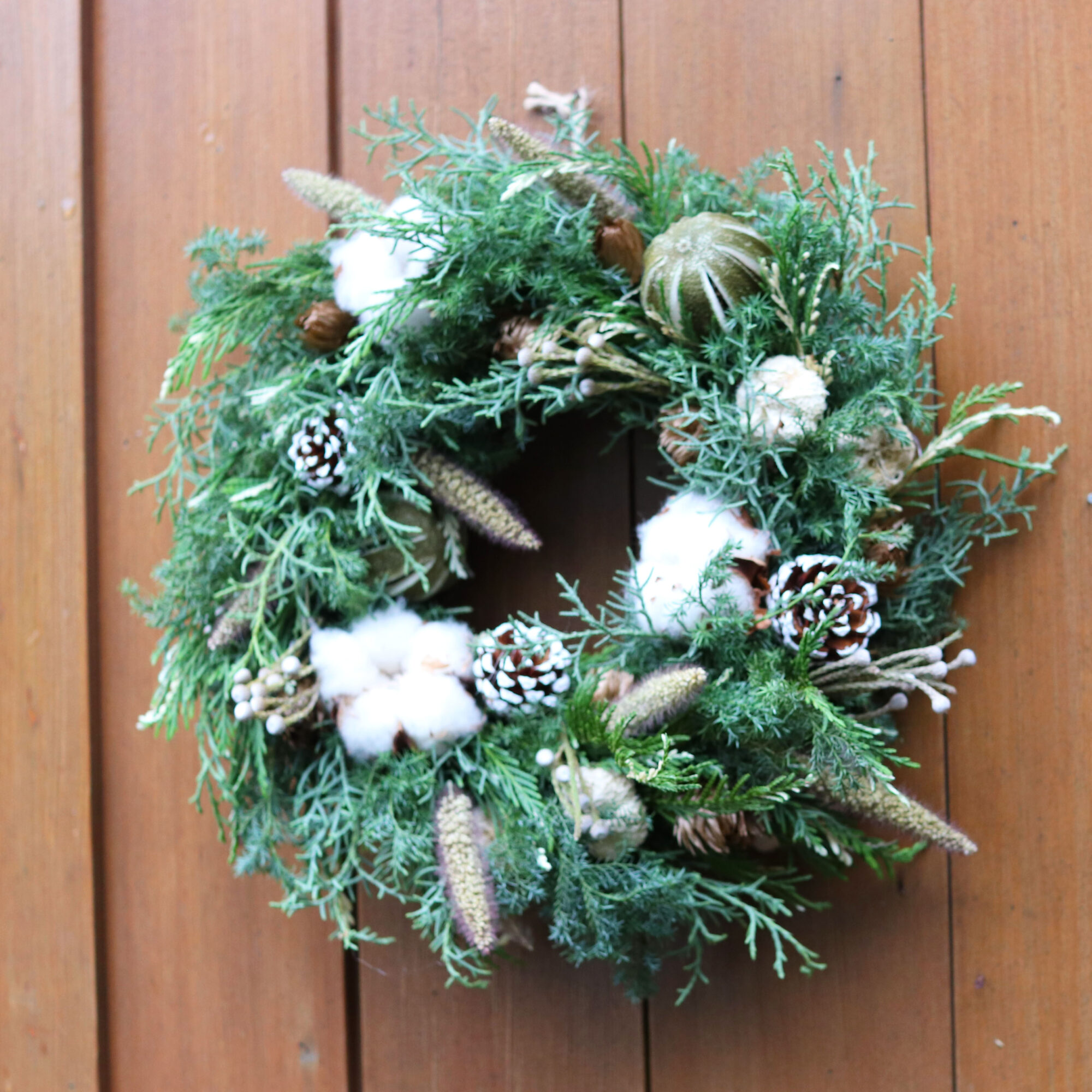 コットンが主役の白い木の実やドライフラワーを使ったラウンドリースです ホワイトクリスマスを感じる冬にぴったりなデザインです