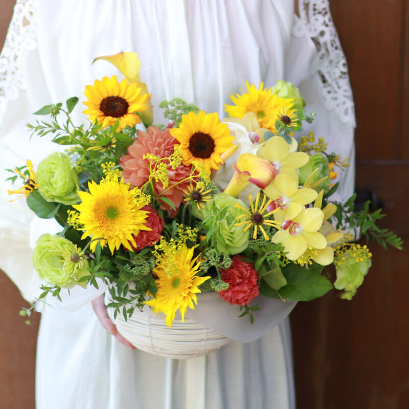 バスケットまたは花器を使用し、生花を吸水性のスポンジに挿してあるので、アレンジされたお花をそのまま飾ることができます。