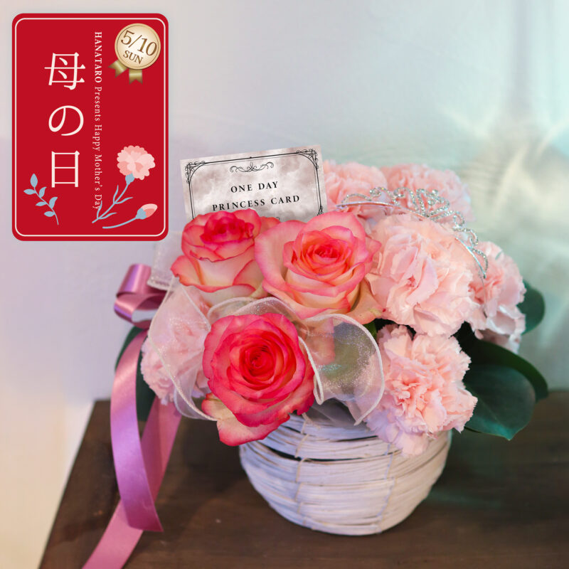 【数量限定】 バラとカーネーションにティアラとリボンを添えたエモーショナルなアレンジメントです また、お母さんが一日プリンセスになれる「ONE DAY PRINCESS CARD」が2枚付属しています InstagramやTikTokで盛れる、母の日のお花を贈りませんか? 【ティアラは実際にご使用いただけます】 ブーケタイプもございます お好きなタイプを選んでください♡