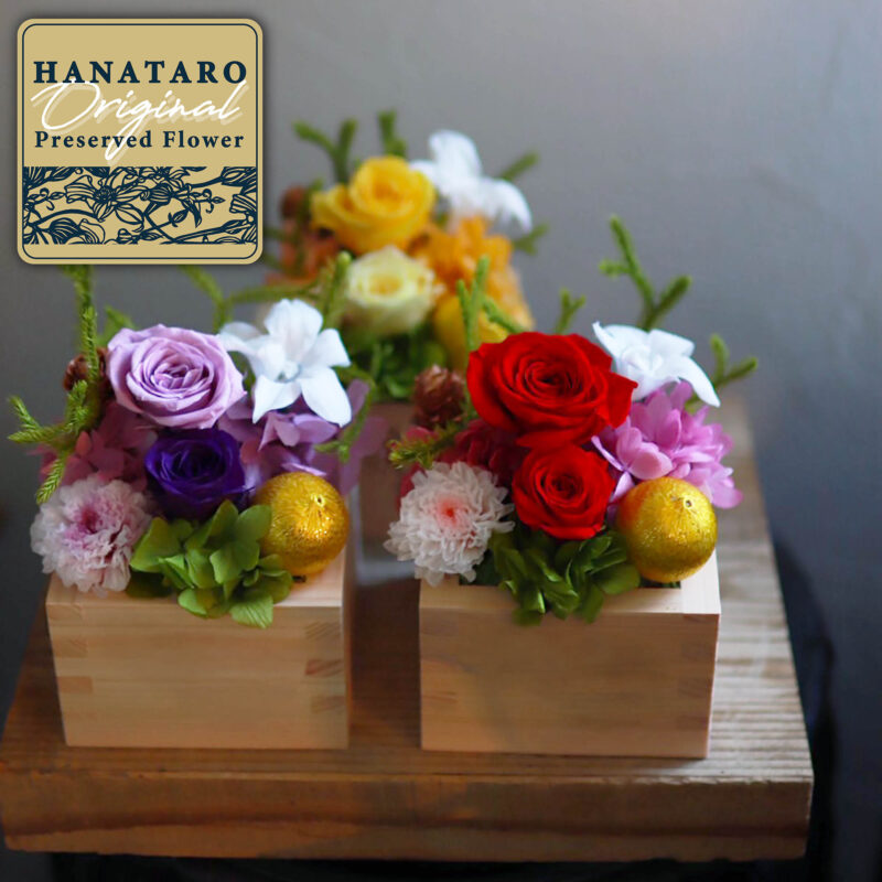 【花たろう オリジナルプリザーブドフラワー】 桝に色鮮やかなお花をあしらった和テイストのプリザーブドフラワーです 長寿のお祝いとしておススメです 還暦には「赤」、古希・喜寿には「紫」、傘寿・米寿には「黄」がお祝いの色味とされています 長寿を願う「祝いマス」を贈って益々家族の絆を深めてみてはいかがでしょうか 敬老の日の贈り物としてもおススメです