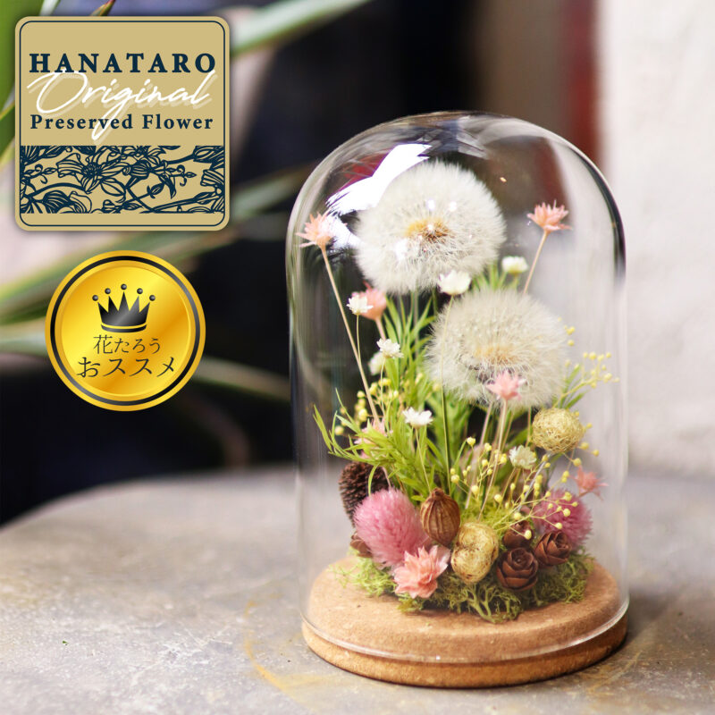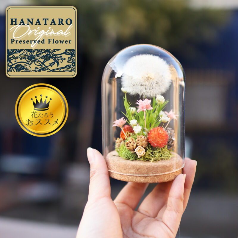 【花たろう オリジナルプリザーブドフラワー】 コンパクトなガラスドームにかわいいお花を集めたプリザーブドフラワーです 場所を取らず小さなスペースにさりげなく飾ることができます 可愛らしい陶器の台座も付いています
