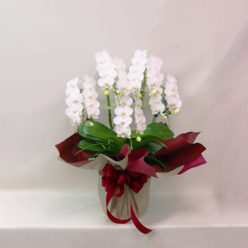 お花は定番の白大輪から赤リップ、ミディ胡蝶蘭など。