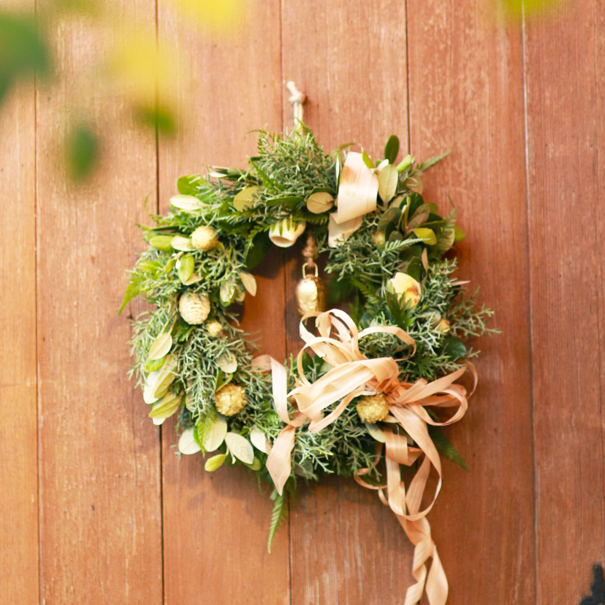 つるの編み込みをベースに、フレッシュなグリーンやドライフラワーなどを使って、ひとつひとつ丁寧にお作りいたします。