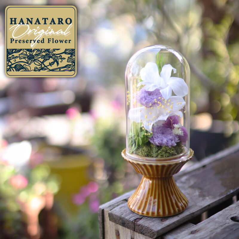 【花たろう オリジナルプリザーブドフラワー】 コンパクトなガラスドームにかわいいお花を集めたプリザーブドフラワーです 場所を取らず小さなスペースにさりげなく飾ることができます 可愛らしい木製の台座も付いています