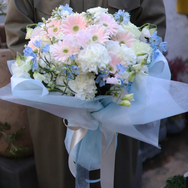 パステルカラーでふんわりと仕上げたロマンチックなスタンディングブーケです 透明感があり、とても人気のある色合いです 色々なご用途でお使いいただけます