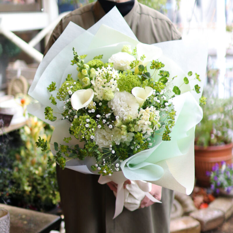 グリーンを多めにあしらったナチュラルな御供の花束です 可憐なカスミソウを散りばめて、可愛らしい雰囲気でお作りします